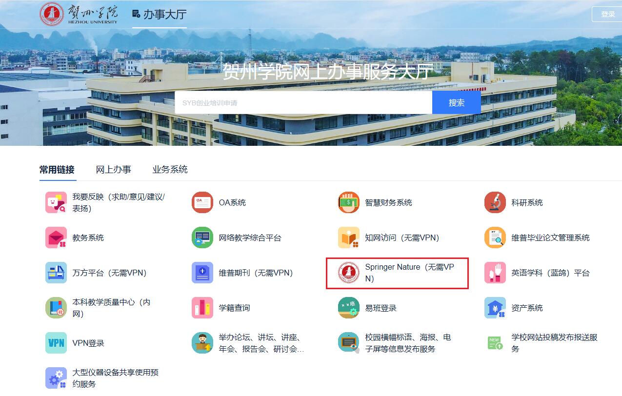 功后首页下拉找到业务系统,点击“Springer Nature(无需 VPN)”: