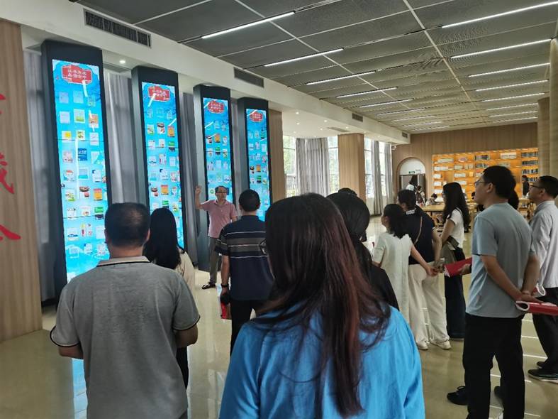 活动伊始,全体党员共同参观了在一楼大厅设立的“食品类图书专题展示区”与“党建+食品主题活动数字互动展播区”。展示区精心陈列了食品科学与工程、食品安全与检测、食品营养与健康、食品加工技术等各类专业图书。一旁的数字互动展区则通过超星瀑布流电子借阅系统,动态展示了“党建+食品”融合的主题内容,将红色精神与食品安全使命、生物科研创新进行了生动链接。