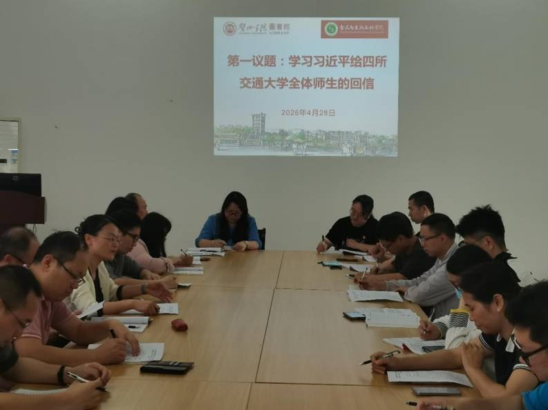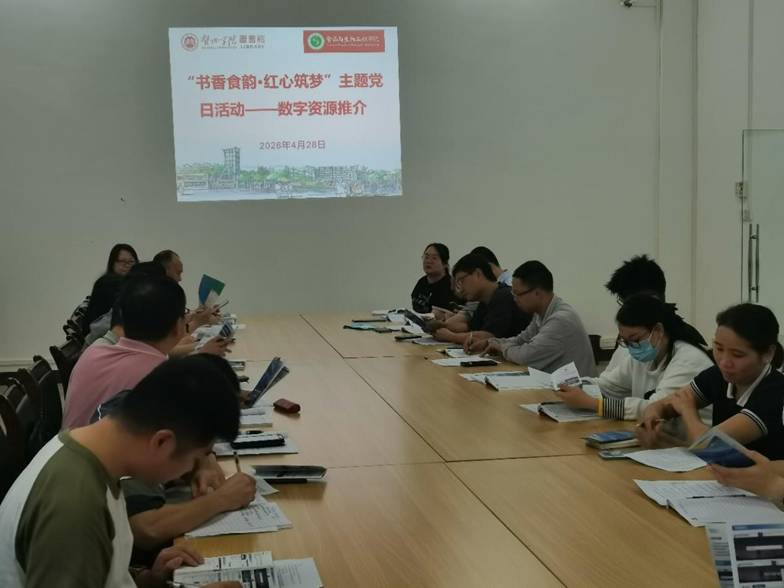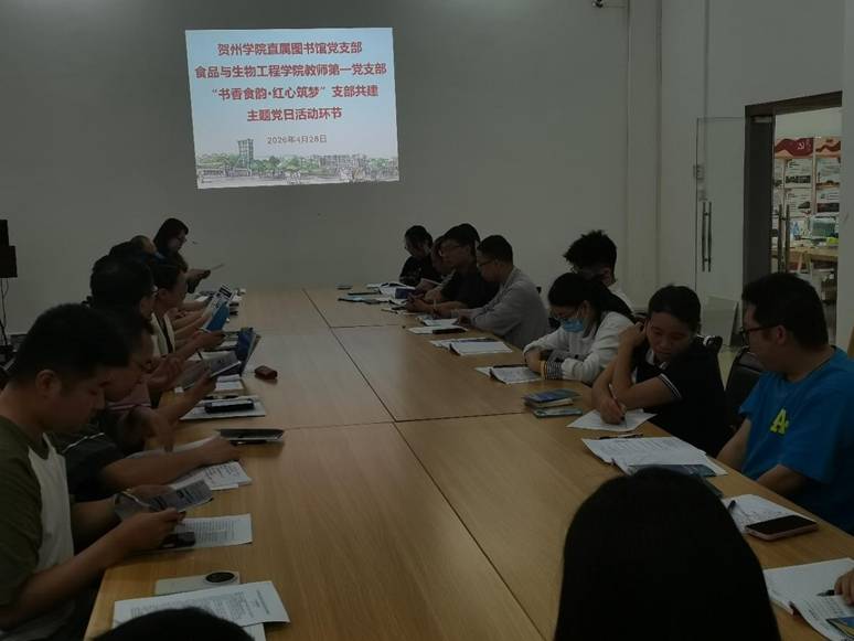 2026年4月28日下午,贺州学院直属图书馆党支部与食品与生物工程学院教师第一党支部在西校区图书馆联合举办了以“书香食韵·红心筑梦”为主题的支部共建活动。本次共建旨在以党建引领,深化资源共享与业务互促,强化图书馆文化育人与学科支撑功能。食品与生物工程学院名誉院长、全国高校“双带头人”教师党支部书记“强国行”专项行动团队负责人段振华,食品与生物工程学院党委书记蔡文,图书馆党支部书记、馆长张金团以及两支部全体党员共同参与。活动由张金团书记主持。